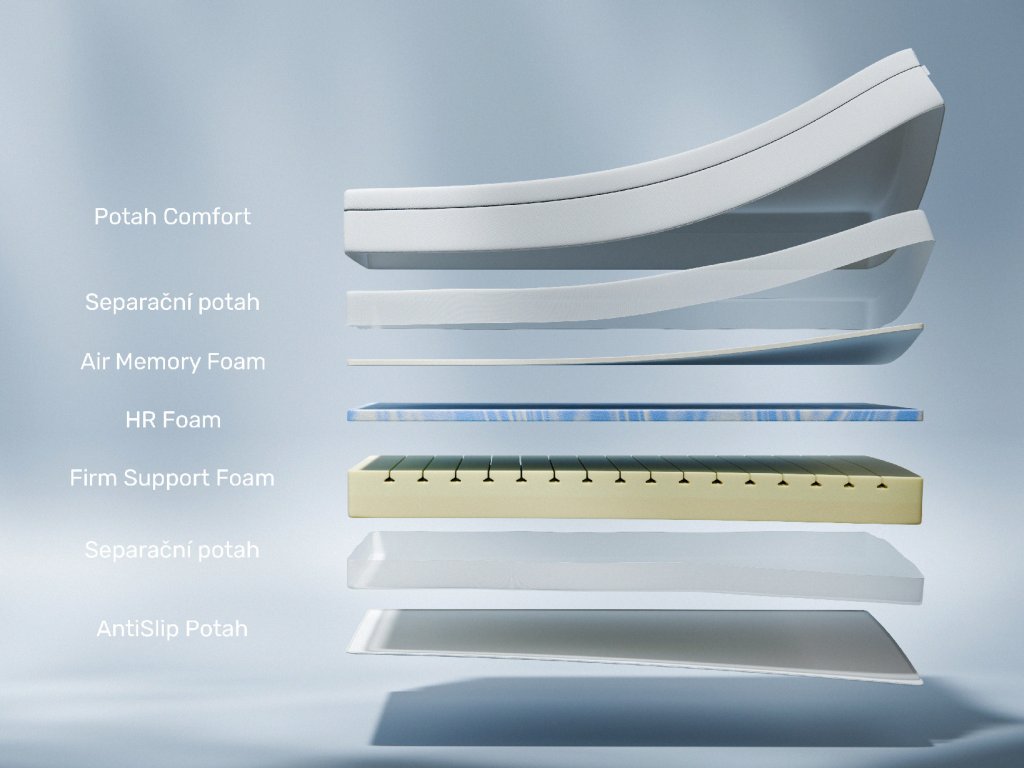 | Složení jádra: | 2 cm Air Memory Foam, 4 cm HR Foam, 16 cm Firm Support Foam |