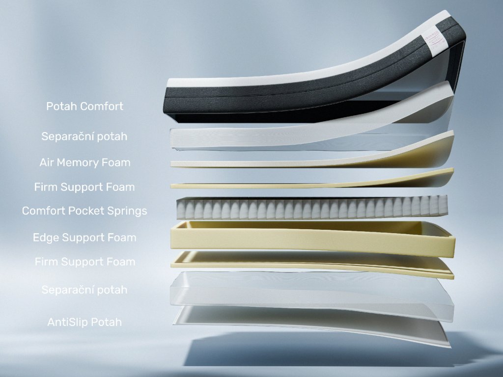 | Složení jádra: | 4 cm Air Memory Foam, 3 cm Firm Support Foam, 12 cm Taštičkové pružiny, 3 cm Firm Support Foam |