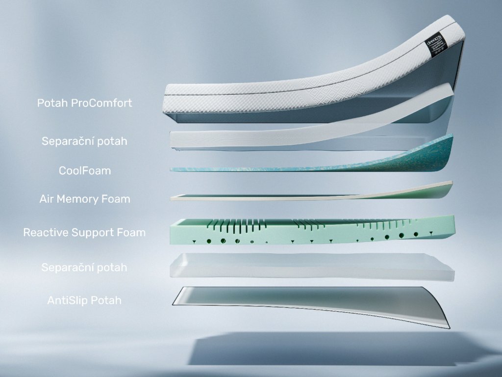 Složení jádra: | 2,5 cm Cool Foam, 2,5 cm Air Memory Foam, 13 cm Reactive Support Foam |